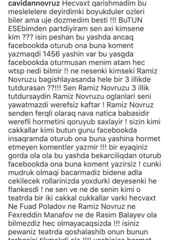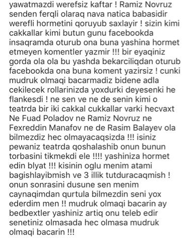 "Hecvaxt qarishmadim bu meslelelere deyirdimki boyukduler ozleri biler ama uje dozmedim besti !!! BuTUN ESEbimden partdiyiram sen axi kimsene kim ??? isin peshan bu yashda ancaq facebookda oturub ona buna koment yazmaqdi 1456 yashin var bu yasgda facebookda oturmusan menim atam hec wtsp nedi bilmir !! ne nesenki kimseki Ramiz Novruzu bagishlayasanda hele bir 3 illikde tutdurasan ??!!! Sen Ramiz Novruzu 3 illik tutdursaydin Ramiz Novruzu oglanlari seni yawatmazdi werefsiz kaftar ! Ramiz Novruz senden ferqli olaraq nava natica babasidir werefli hormetini qoruyub saxlayir ! sizin kimi cakkallar kimi butun gunu facebookda insaqramda oturub ona buna yashina hormet etmeyen komentler yazmir !!! bir eyaqiniz gorda ola ola bu yashda bekarciliqdan oturub facebookda ona buna koment yazirsiz ! cunki mudruk olmaqi bacarmadiz bidene adla cekilecek rollarinizda yoxdurki deyesenki he flankesdi ! ne sen ve ne de senin kimi o teatrda bir iki cakkal cukkallar varki hecvaxt Ne Fuad Poladov ne Ramiz Novruz ne Fexreddin Manafov ne de Rasim Balayev ola bilmezdiz hec olmayacaqsizda !!! isiniz pewaniz teatrda qoshalashib onun bunun torbasini tikmekdi ele !!!! yashiniza hormet edin blyat !!! kisinin oglu menim atami bagishlayibmish ve 3 illik tutduracaqmish ! onun sonrasini dusune sen menim caynaqimdan qurtula bilmezdin seni yox ederdim men !! mudruk olmaqi bacarin ay bedbextler yashiniz artiq onu teleb edir senetiniz olmasada hec olmasa mudruk olmaqi bacarin !!!"
