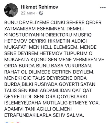 Məşhur aktyor Hikmət Rəhimov Cəfər Cabbarlı adına Azərbaycan Kinostudiyasının direktoru Müşfiq Hətəmov haqqında sosial şəbəkədən etdiyi paylaşım hər kəsin diqqətinə səbəb olub. Belə ki, Hikmət Rəhimov Türkiyədə keçirilən 5-ci Antakya Beynəlxalq Film Festivalının mükafatlandırma mərasimində Hikmət Rəhimov "Üçüncü günün adamı" filmindəki roluna görə "Ən yaxşı aktyor" nominasiyasında qalib olmuşdu. Aktyor paylaşımında Kinostudiyanın direktorunun bu haqda söylədiyi fikirlərə etiraz edib. Olaylar.az Hikmət Rəhimovun facebook sosial şəbəkəsində yazdığı statusu olduğu kimi təqdim edir: