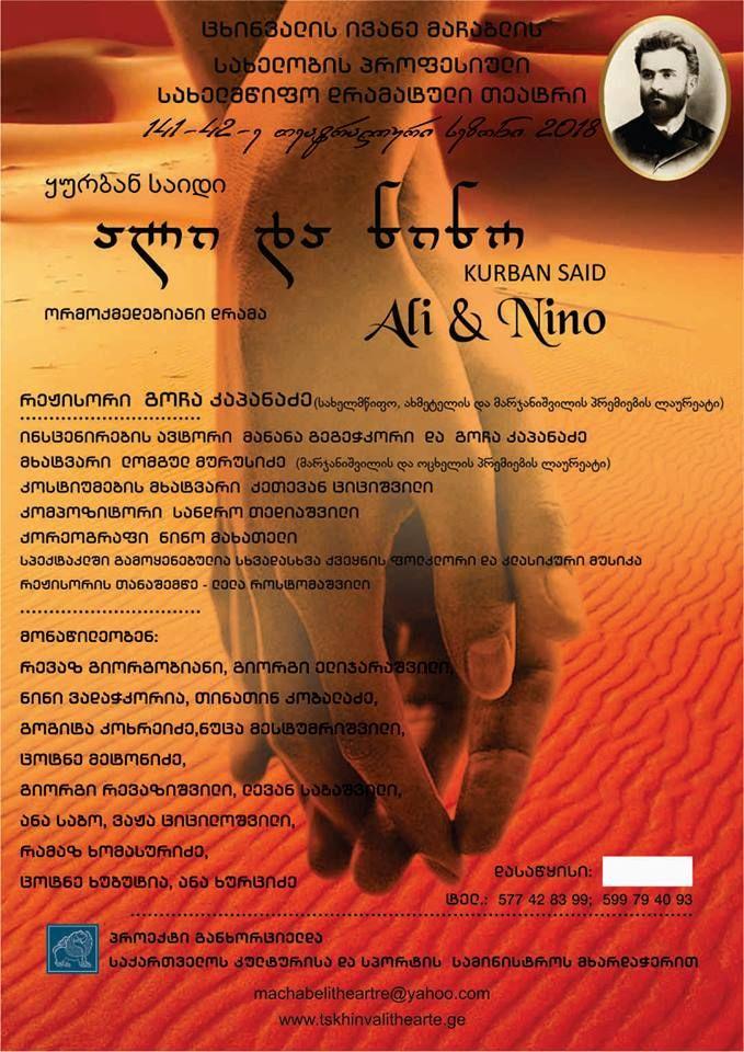 "Əli və Nino" əsəri Gürcüstanda ilk dəfədir səhnələşdirilib. Tamaşada müxtəlif ölkələrin folklor və klassik musiqilərindən istifadə olunub. Tamaşa Gürcüstan və Azərbaycanda ilk respublikaların yaranmasının 100 illik yubileyinə həsr olunub.