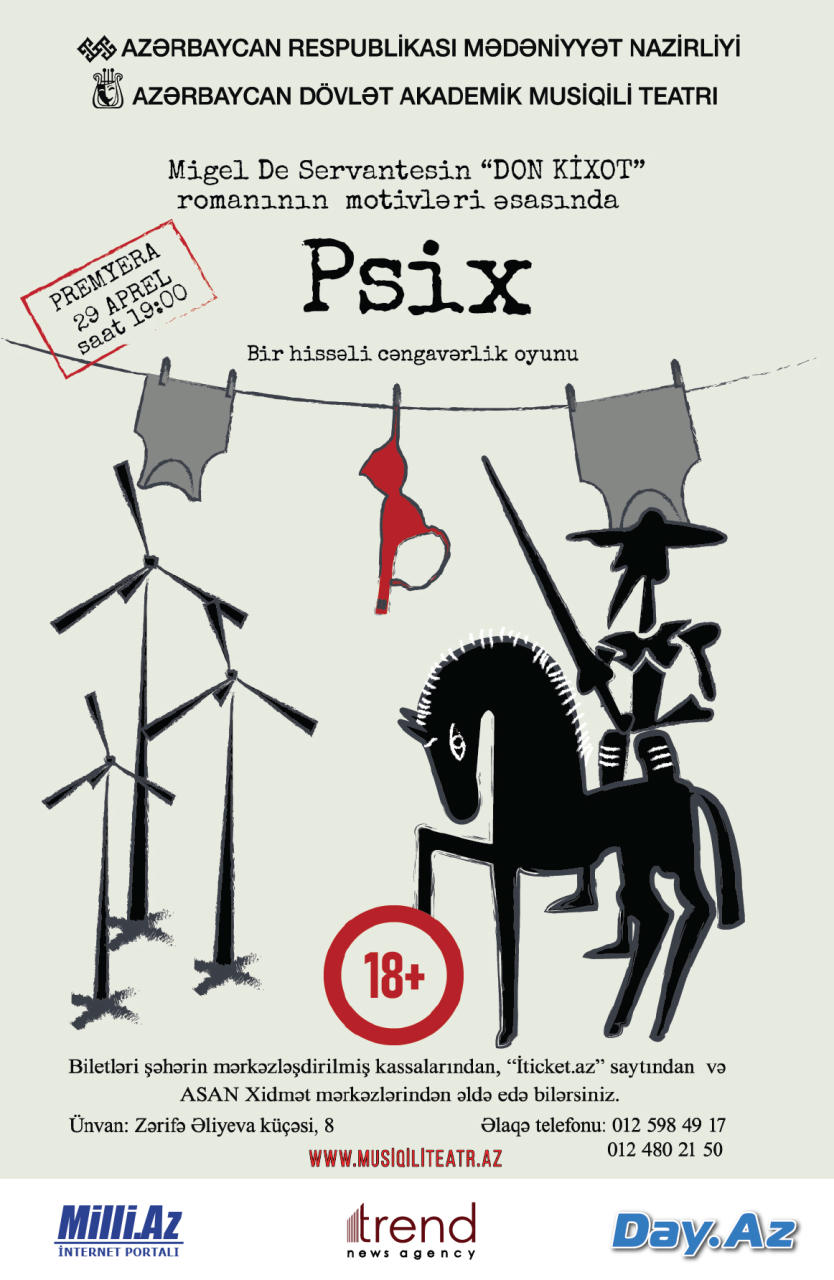 6 Aprel 2022 18:50 Teatr və kino29 aprel saat 19:00-da Azərbaycan Dövlət Akademik Musiqili Teatrında dünya şöhrətli ispan yazıçısı Migel de Servantesin "Don Kixot" romanının motivləri əsasında hazırlanan "Psix" tamaşasının premyerası olacaq.