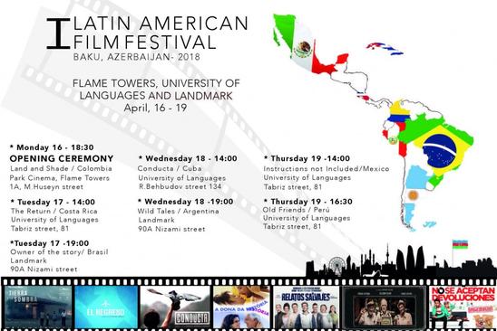 Meksikanın Azərbaycandakı səfirliyinin təşkilati dəstəyi ilə aprelin 16-dan 19-dək Bakıda ilk Latın Amerikası Kinofestivalı keçiriləcək. Festival çərçivəsində filmlər “Park Cinema” (“Flame Towers”) kinoteatrında, “Landmark” kompleksinin kino zallarında, həmçinin Azərbaycan Dillər Universitetinin binasında nümayiş etdiriləcək.