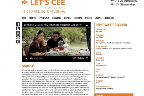 Azərbaycanlı rejissor İlqar Nəcəfin “Nar bağı” bədii filmi Vyanada “LET´S CEE” beynəlxalq film festivalında nümayiş olunub. Mədəniyyət və Turizm Nazirliyinin sifarişi ilə Cəfər Cabbarlı adına “Azərbaycanfilm” kinostudiyası və “Buta Film” kino şirkətinin birgə istehsalı olan ekran əsəri tamaşaçılar və kinematoqrafçılar tərəfindən böyük maraq və rəğbətlə qarşılanıb. Filmin ssenari müəllifləri Asif Rüstəmov, İlqar Nəcəf, Roelof Jan Minneboo, quruluşçu rejissoru İlqar Nəcəf, quruluşçu operatoru Ayhan Salar, quruluşçu rəssamı Rafiq Nəsirov, bəstəkarı Firudin Allahverdi, icraçı prodüseri Akif Əliyev, prodüserləri Müşfiq Hətəmov və İlqar Nəcəfdir.
