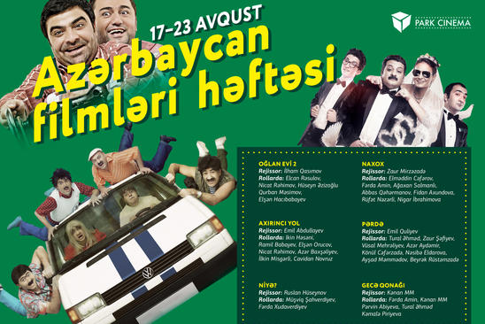 17-23 avqust tarixlərində Park Cinema kinoteatrlar şəbəkəsi azərbaycan filmləri nümayiş olunacaq. Filmsevərlər Metro Park ticarət mərkəzində yerləşən kinoteatrda bir həftə ərzində “Oğlan evi 2”, “Naxox”, “Gecə qonağı”, “Niyə?”, “Pərdə” filmlərini izləmək imkanı olacaq.