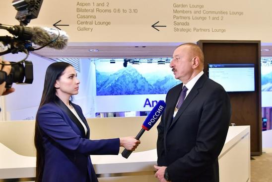 Yanvarın 21-də Azərbaycan Respublikasının Prezidenti İlham Əliyev Davosda “Rossiya 1” televiziya kanalına müsahibə verib. Həmin müsahibə yanvarın 28-də “Rossiya 24” kanalında yayımlanıb. “Rossiya 24” telekanalının aparıcısı dedi: Bəzi ölkələrin beynəlxalq təşkilatların qərarlarına, BMT Təhlükəsizlik Şurasının qətnamələrinə seçici yanaşması mövcud dünya quruluşuna mənfi təsir edir. Qaydaların pozulması ölkələr arasında gərginliyə gətirib çıxarır, qarşılıqlı fəaliyyətin səviyyəsi aşağı düşür və biznesi aparmaq çətinləşir.