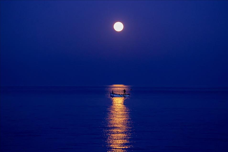 Van gölünün mavi sularında balıq ovu edən balıqçıların suda hərəkəti və ay işığının suda əksi belə bir mənzərə yaradıb: